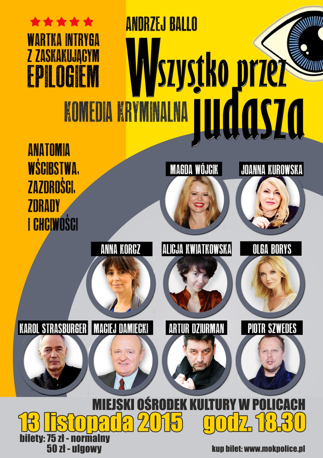 17 listopada 2015 „Wszystko przez judasza” Komedia w gwiazdorskiej obsadzie bawiła licznie zgromadzoną w MOK-u publiczność. Żywe reakcje oraz opinie zasłyszane w kuluarach świadczyły o udanym wieczorze. Fabuła spek... czytaj dalej >