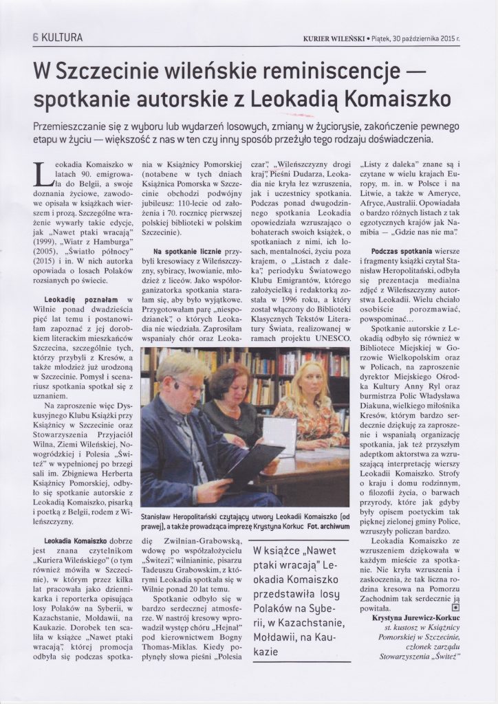 2 listopada 2015 o spotkaniu z poetką Leokadią Komaiszko W Kurierze Wileńskim o spotkaniu z poetką Leokadią Komaiszko w Miejskim Ośrodku Kultury w Policach – zapraszamy do lektury.... czytaj dalej >