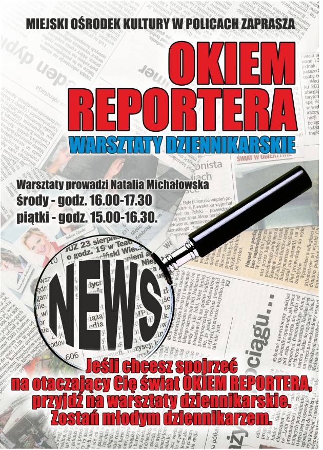 1 października 2014 OKIEM REPORTERA – zapraszamy do udziału! Warsztaty dziennikarskie „Okiem reportera” odbywają się w środy w godz. 16-17:30 i czwartki w godz. 15:30-17 w sali nr 5. Zajęcia skierowane są do młodzieży w wieku 13-1... czytaj dalej >