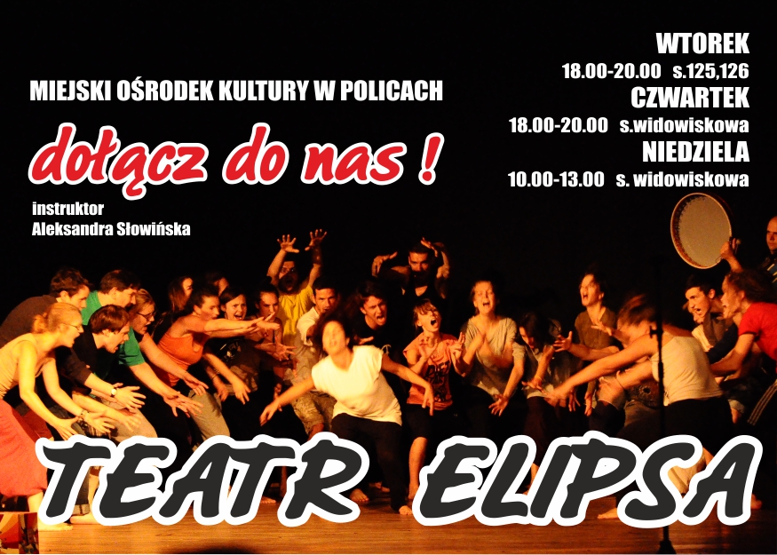 1 października 2014 dołącz do nas- TEATR ELIPSA Jesteśmy grupką młodych i kochających teatr, przyjaciółmi i zakręconymi ludźmi… Działami w Miejskim Ośrodku Kultury w Policach i zapraszamy do udziału w naszych przeds... czytaj dalej >